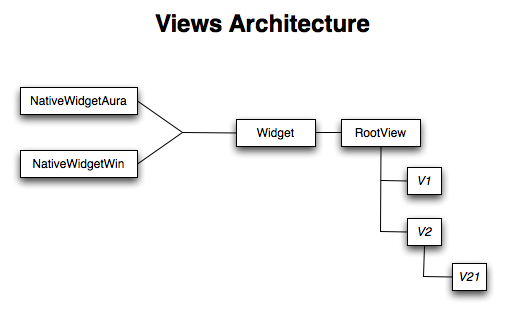 Views is a user interface framework built on a type called, confusingly, View. Responsible for providing the content of our Aura windows, most of this code is also used by Desktop Chrome on Windows. Only the NativeWidget implementation differs (for now). Views also provides a set of useful reusable controls like Buttons, Menus, etc.
